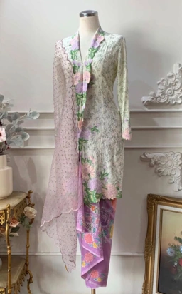 This set consists of a kebaya made from Rubiah voile fabric with Seruni embroidery motifs, a purple Paris batik skirt, and a purple Rubiah organza polka-dot shawl.