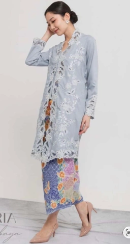 This set consists of a kebaya made from cotton embroidery fabric, paired with a light blue batik skirt.